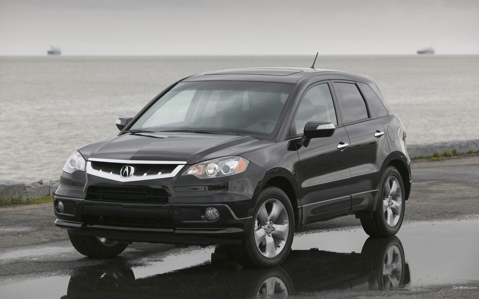 Description: A black suv parked on a wet road near the ocean and a boat in the water behind it.