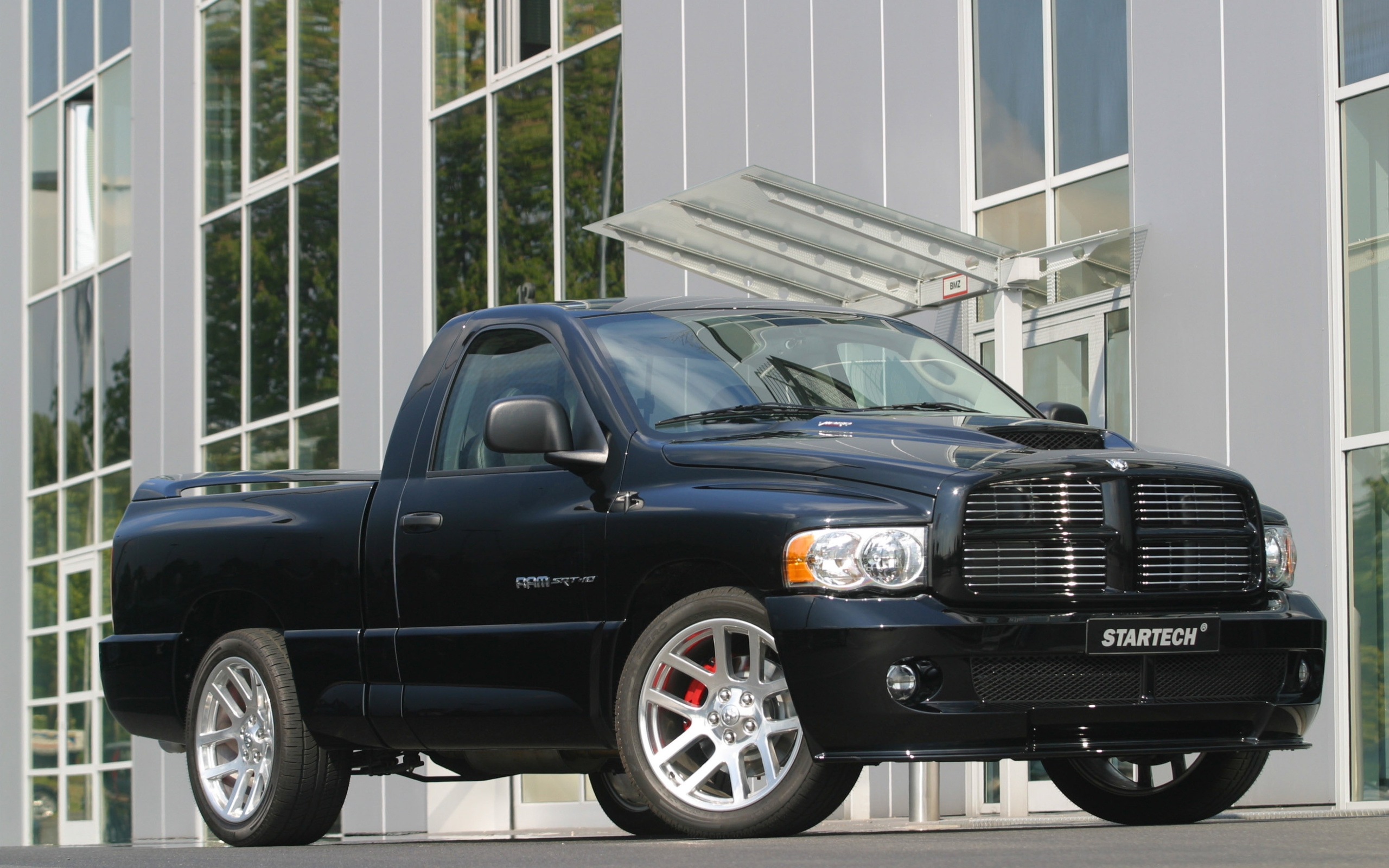 Description: A black truck parked in front of a building with a large window on the side of it's side.