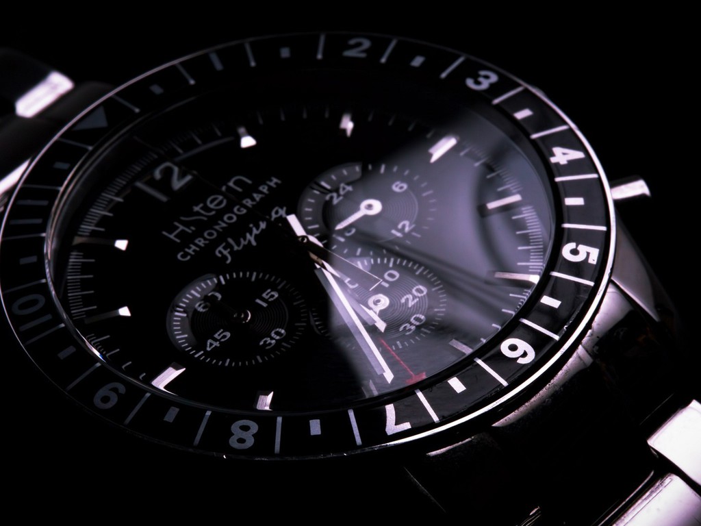 Description: A watch with a black face and black hands on a black background with a silver strap and a black dial.