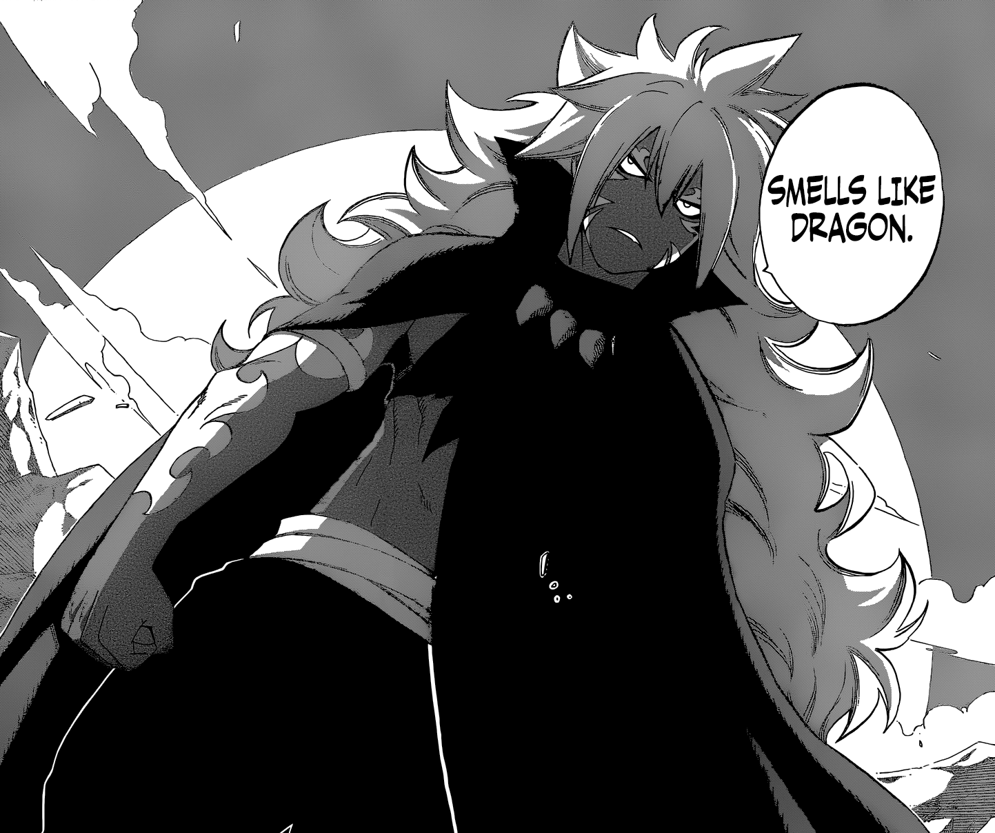Description: A black and white anime character with long hair and a speech bubble that says smells like dragon on it.