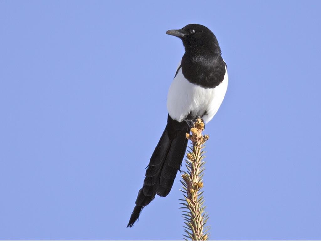 Description: A black and white bird sitting on top of a plant with a blue sky in the background and a few small leaves.