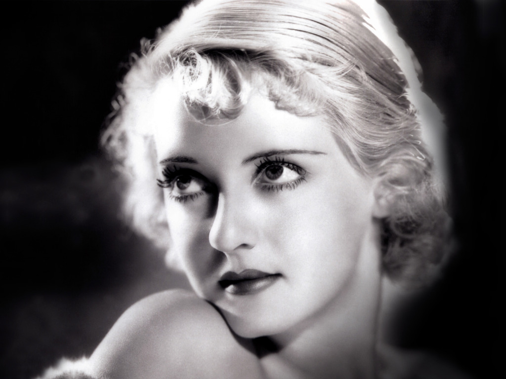 Description: A black and white photo of a woman with blonde hair and a fur collar on her head and shoulders.