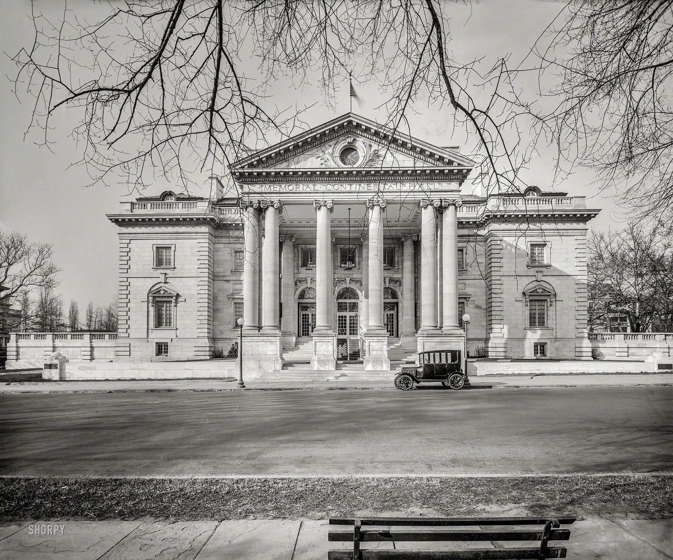 Description: A black and white photo of a building with a car parked in front of it and a tree in front of it.