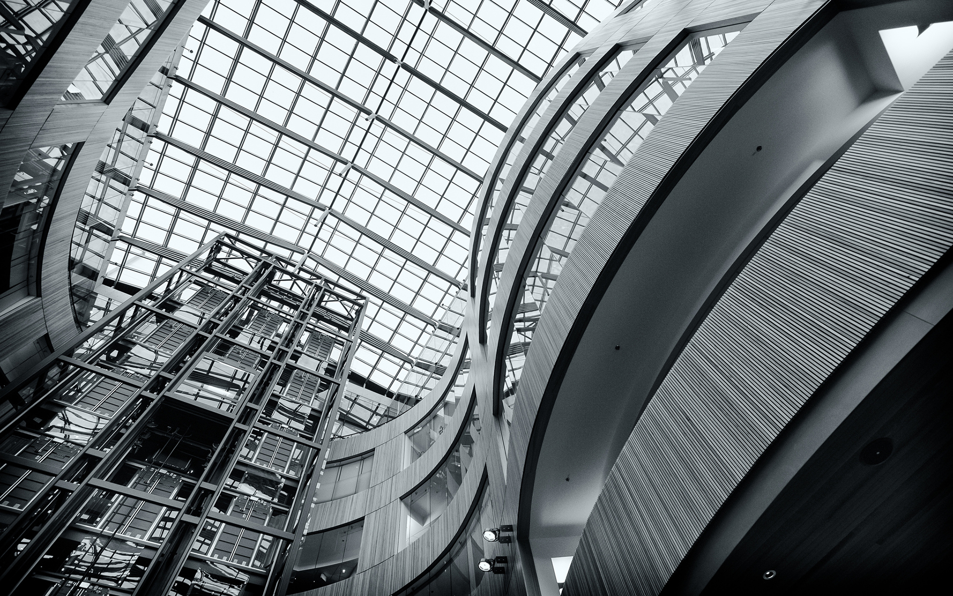 Description: A black and white photo of a building with a skylight above it and a spiral staircase leading up to the top.