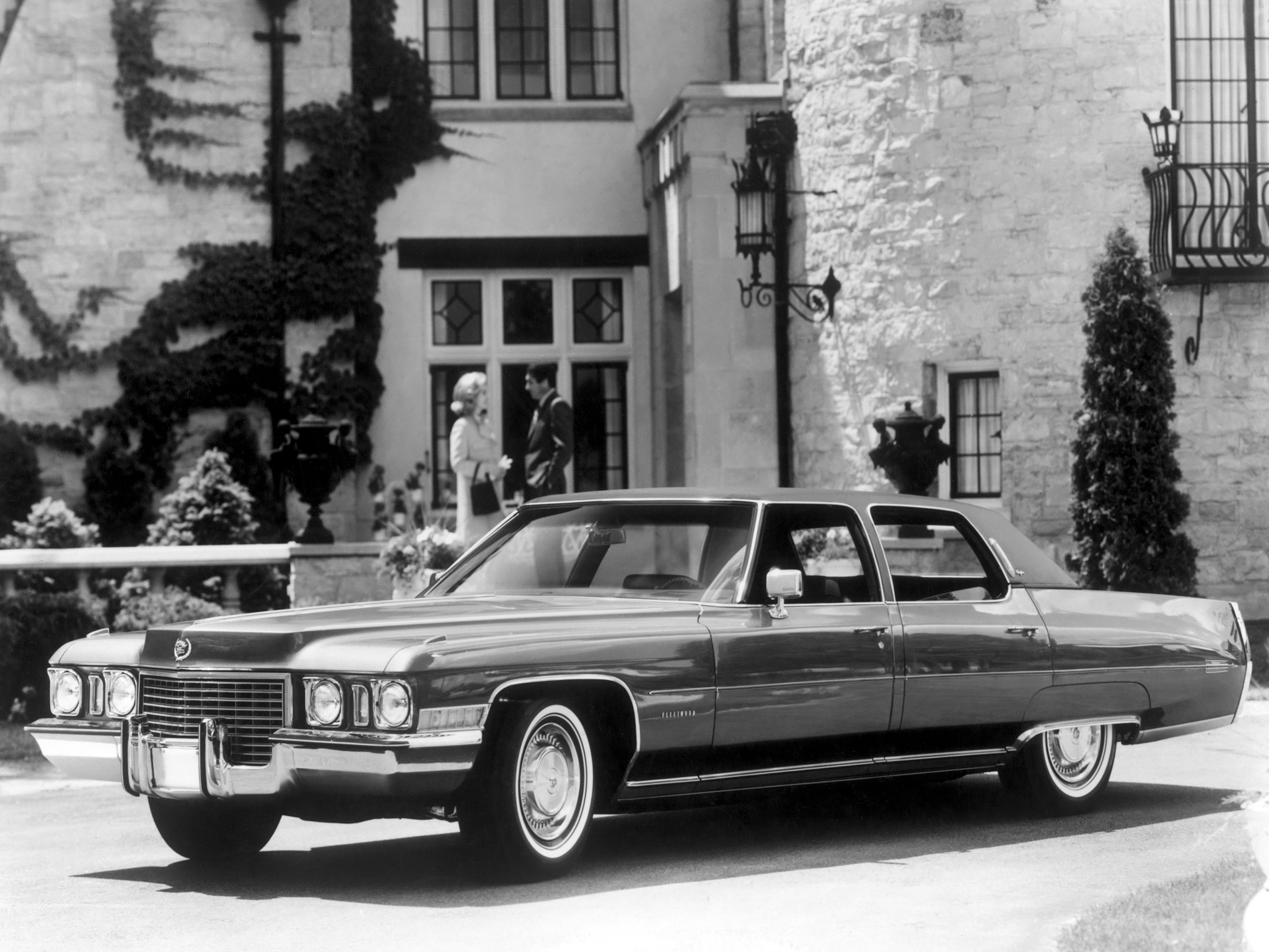 Description: A black and white photo of a car parked in front of a building with a woman standing in the doorway.