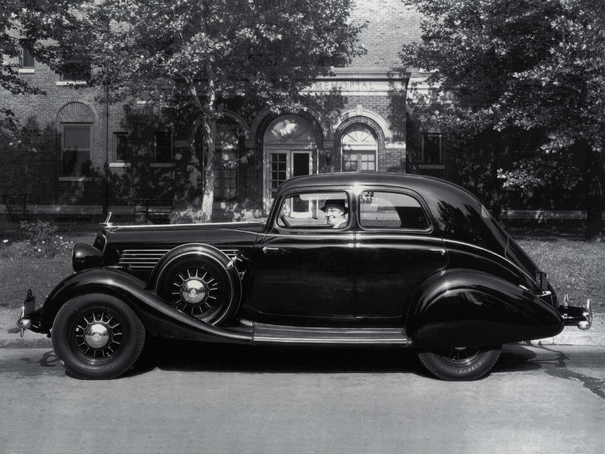 Description: A black and white photo of a car parked in front of a building with trees in the background and a man in the driver's seat.