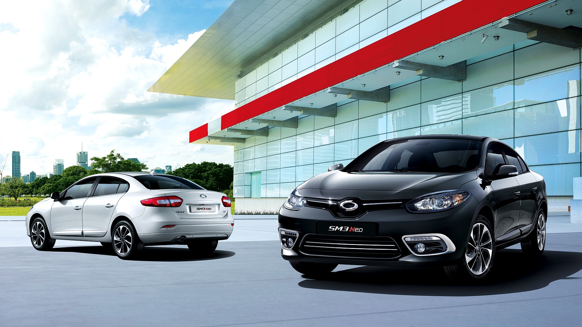 Description: Two cars parked in front of a building with a sky background and clouds in the background.
