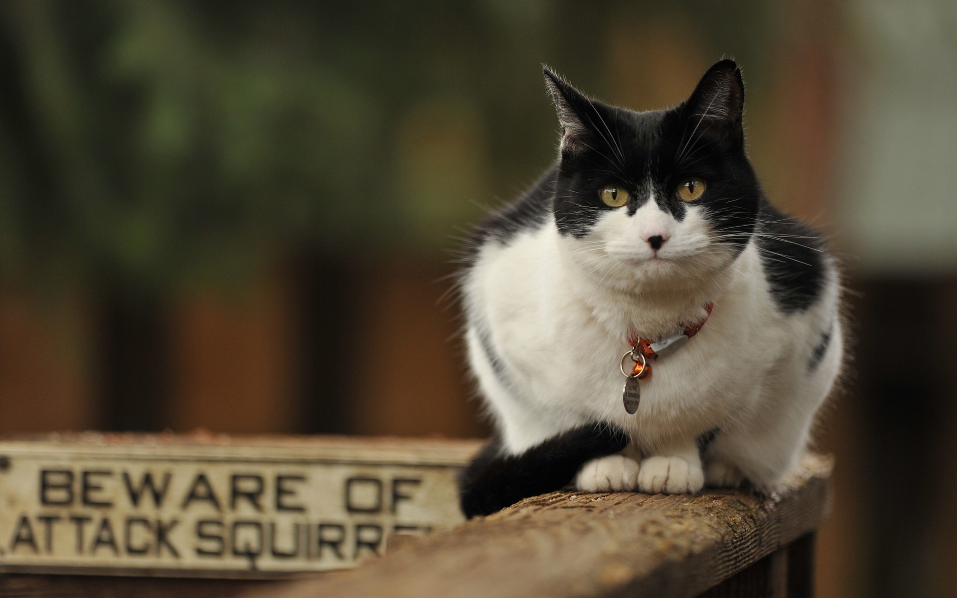 Description: A black and white cat sitting on a fence post with a sign behind it that says beware of attack squirrel.