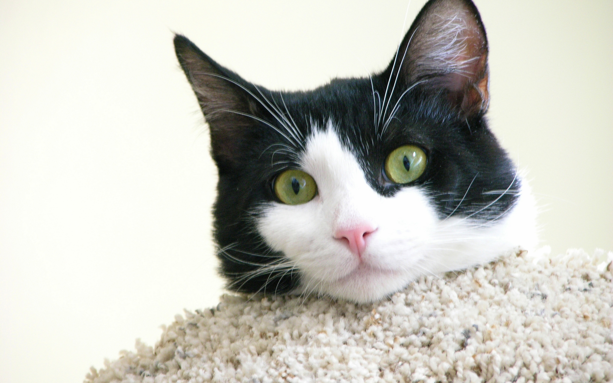 Description: A black and white cat with green eyes sitting on a pile of gravel looking at the camera with a sad look on its face.