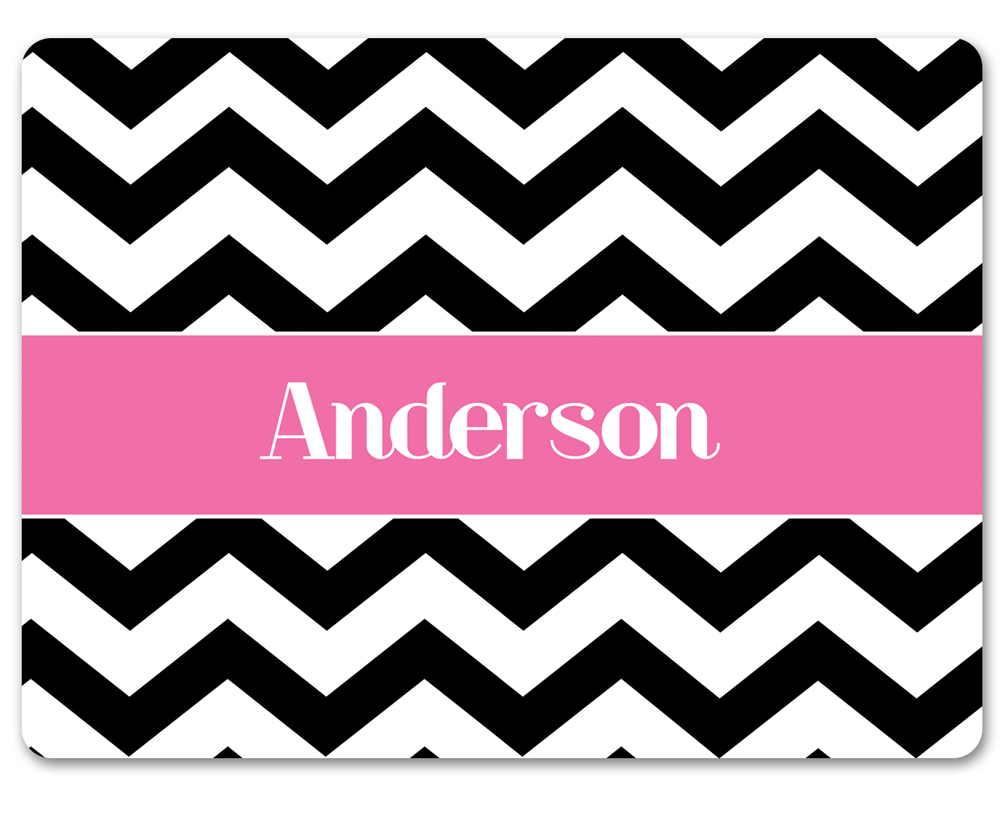 Description: A black and white chevroned pattern with a pink name on it.