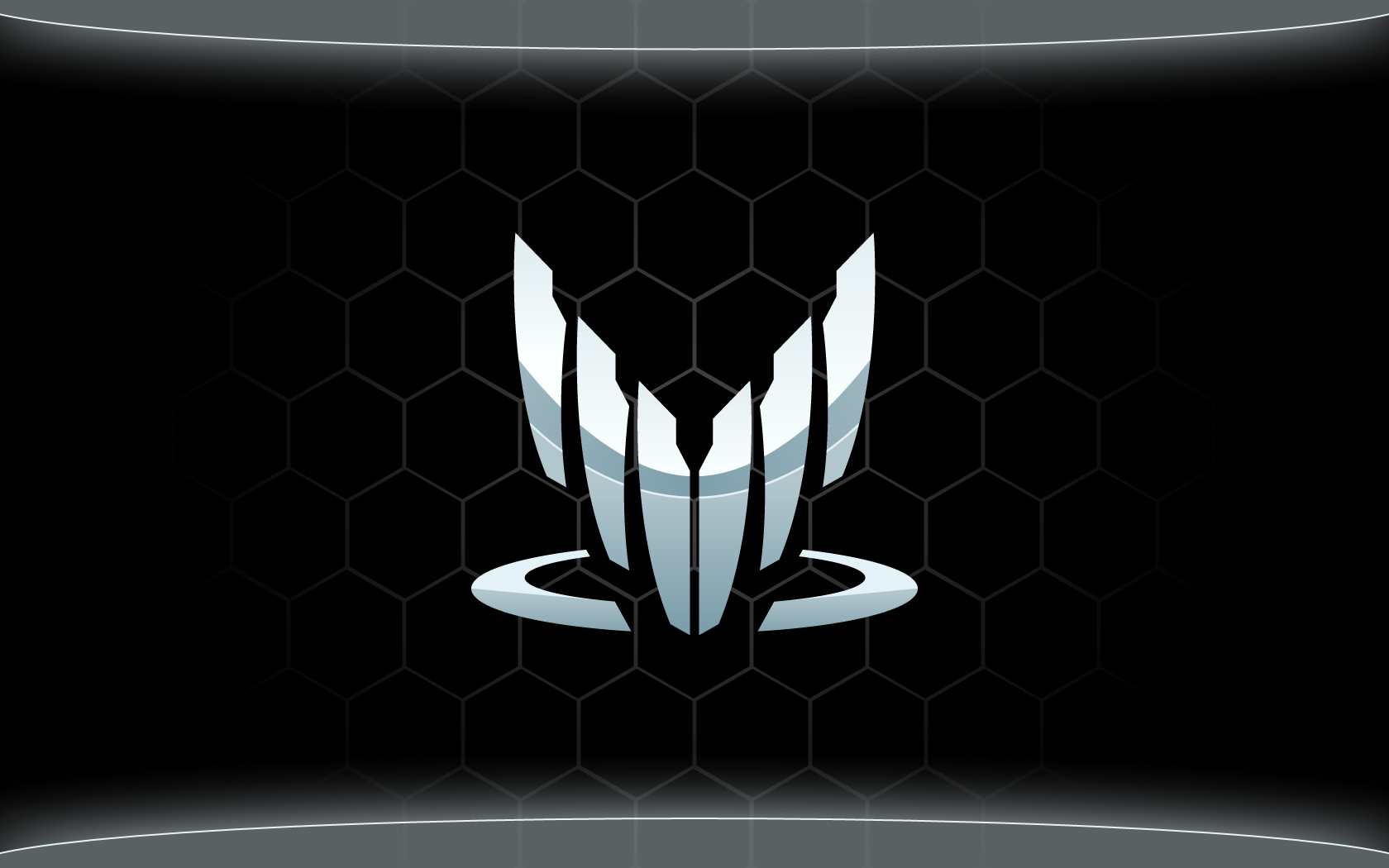 Description: A black and white logo with a white ring on it's center piece and a black background with a grid pattern.