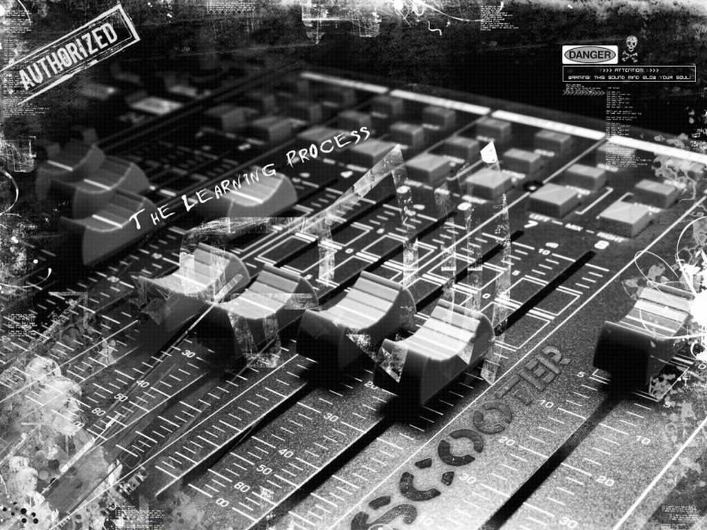 Description: A black and white photo of a computer keyboard with the words the flaming roses on it and a picture of a man on the keyboard.