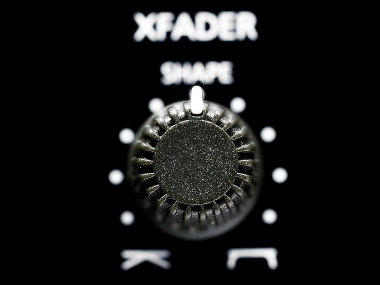 Description: A close up of a black and white control panel with white letters on it and a black background with white letters.