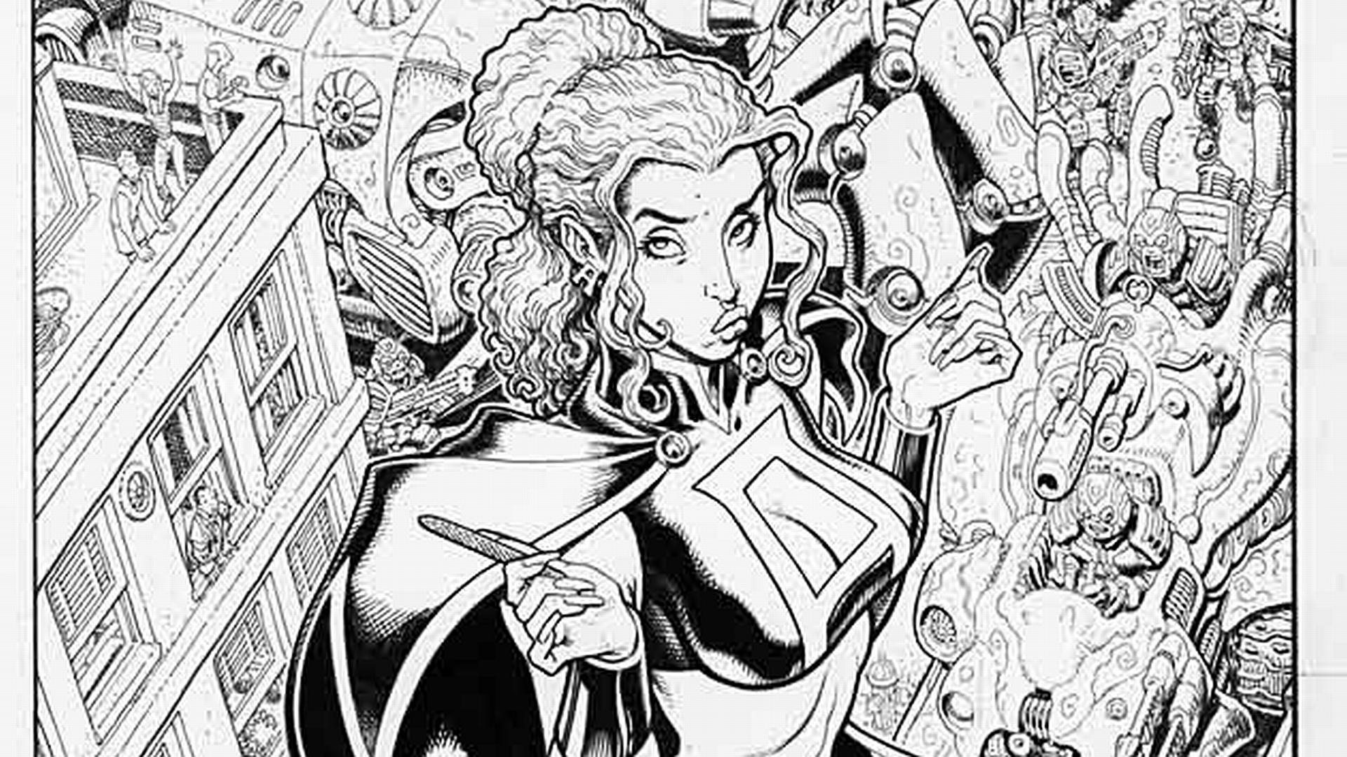 Description: A black and white drawing of a man surrounded by people and a woman with a gun in her hand.