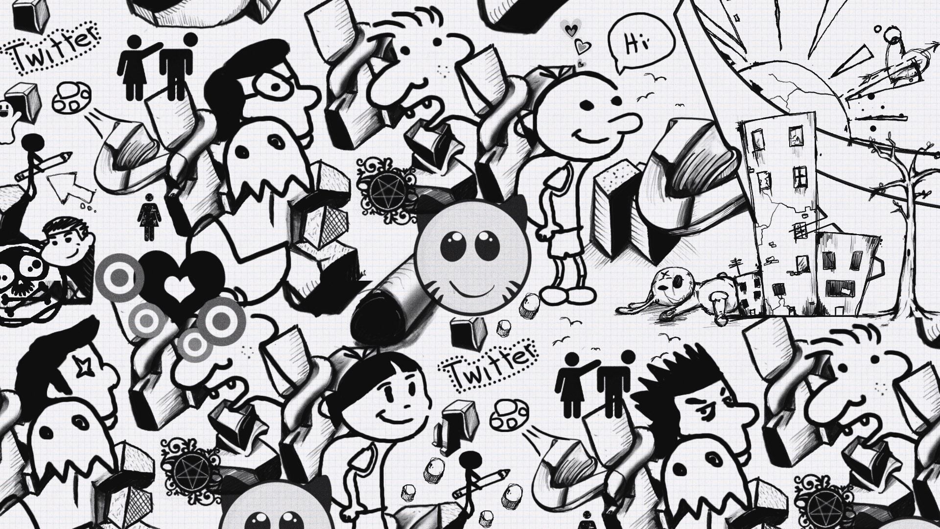 Description: A black and white drawing of many people and graffiti on a wall with a building in the background and a person in the foreground.