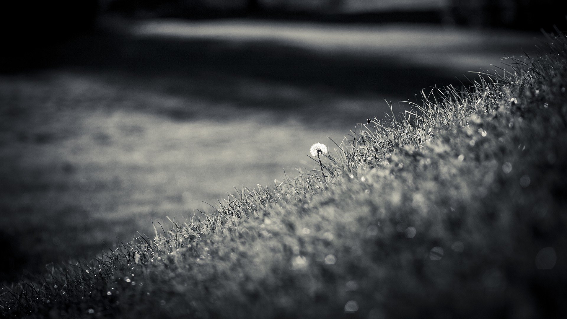 Description: A black and white photo of a field with a dandelion in the middle of it.