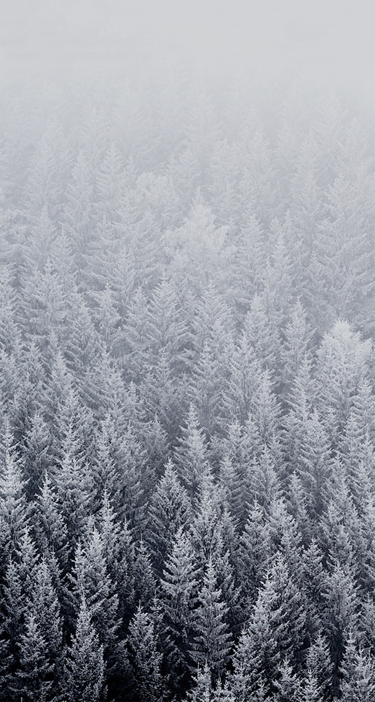 Description: A black and white photo of a forest covered in snow and frosting trees in the distance.