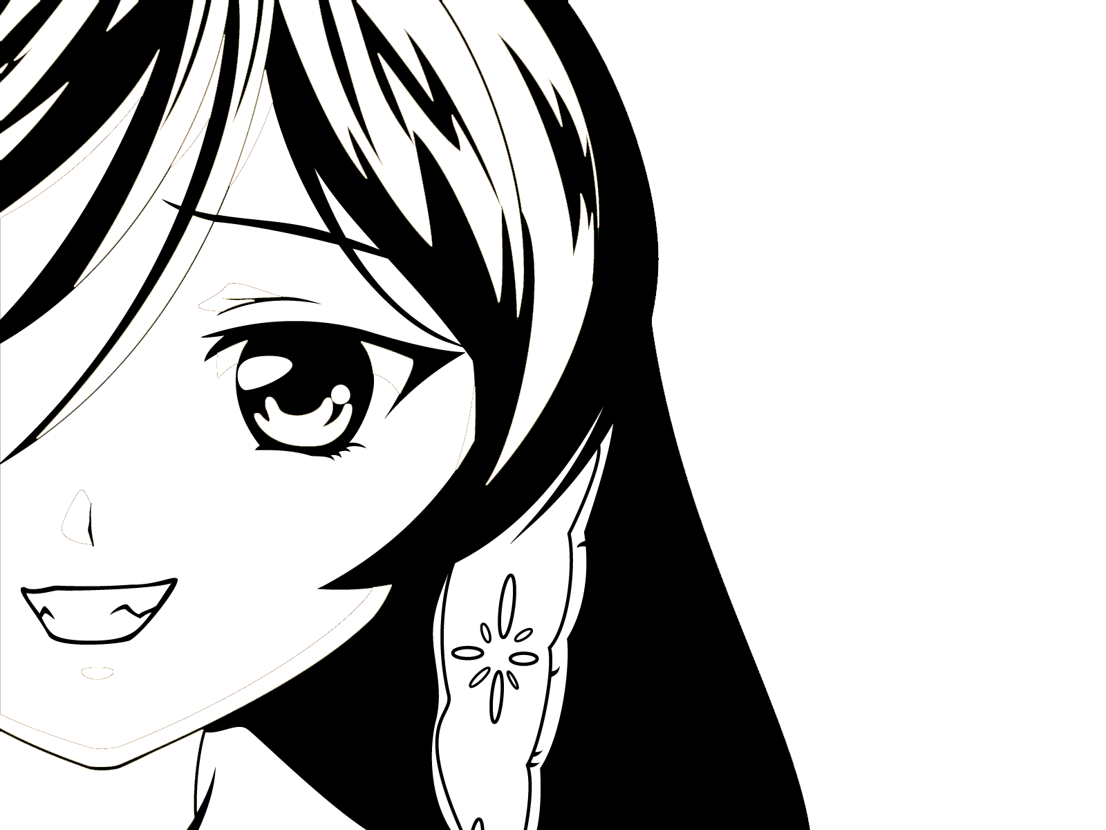 Description: A black and white drawing of a girl with long hair and a pair of scissors in her hand.