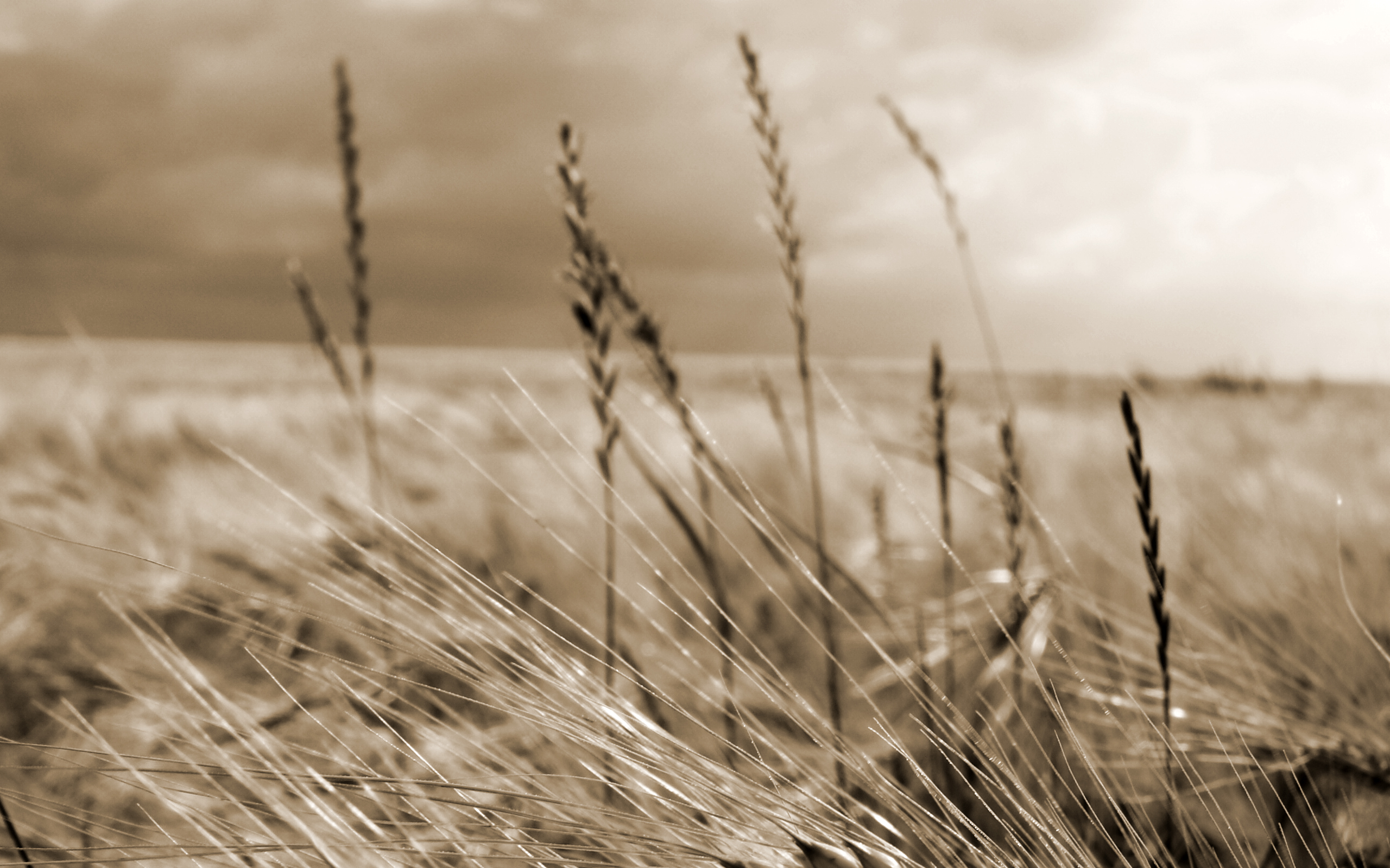 Description: A black and white photo of a field of grass with a sky background and clouds in the distance with a few clouds.