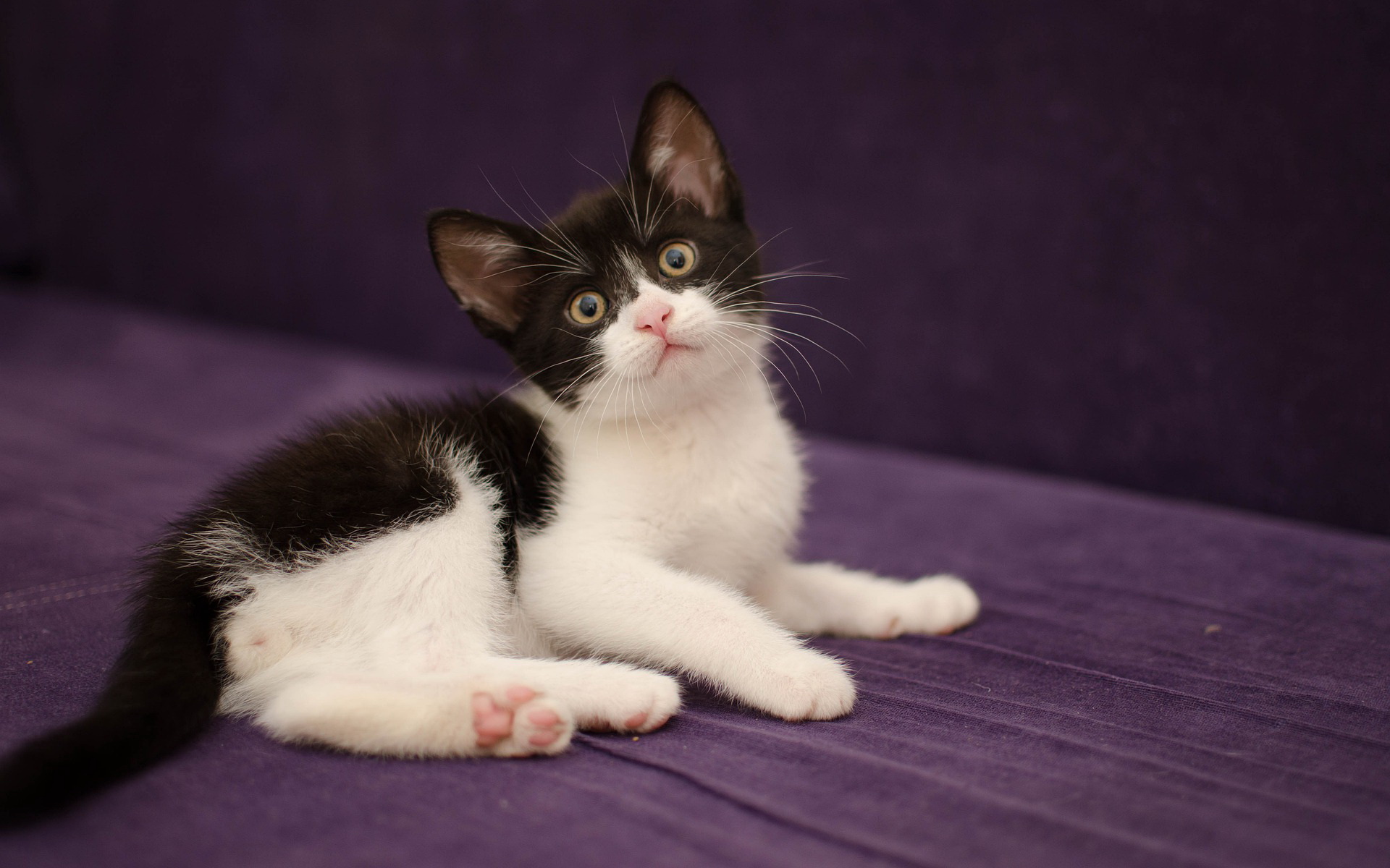 Description: A black and white kitten sitting on a purple couch looking up at the camera with a sad look on its face.