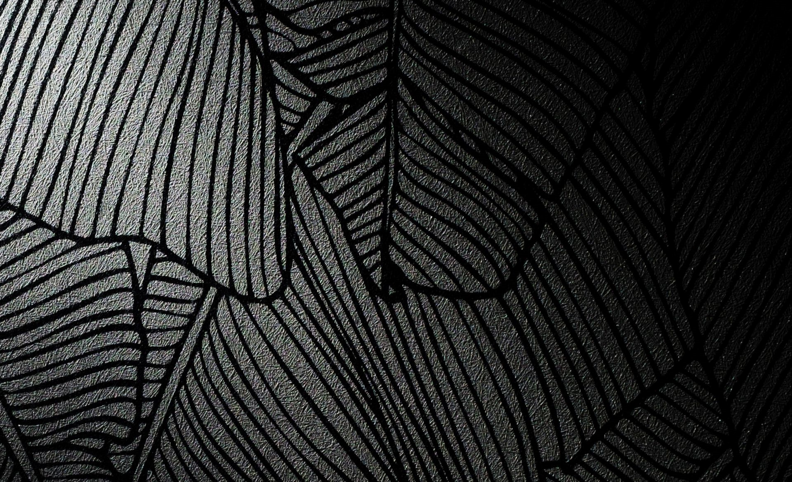 Description: A black and white photo of a leaf pattern on a wallpapered wall with a black background and a black and white photo of a leaf pattern.