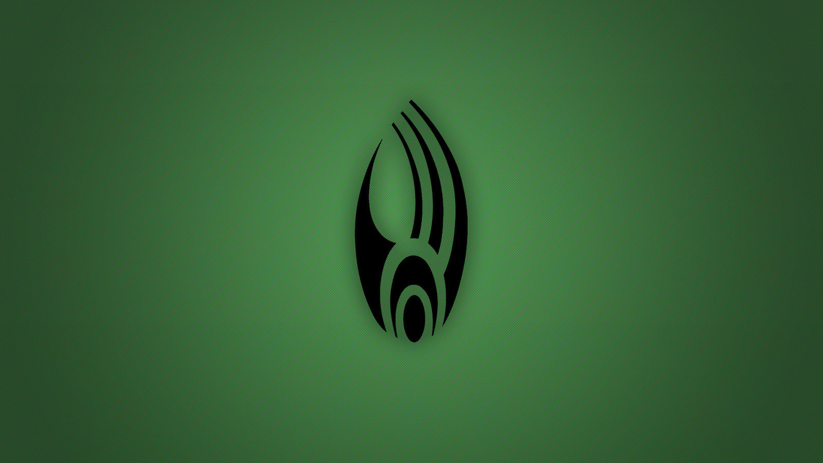 Description: A black and white logo on a green background with a shadow of a fork and spoon in the center.