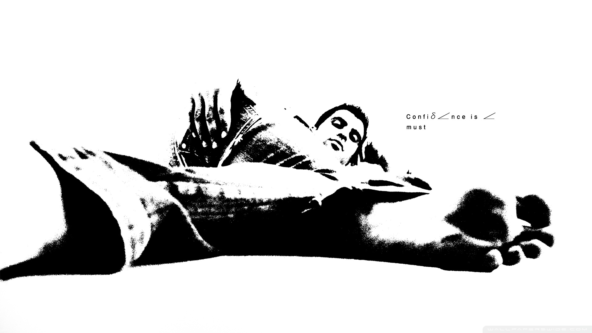 Description: A black and white photo of a person laying down with a butterfly on his head and a text above it.