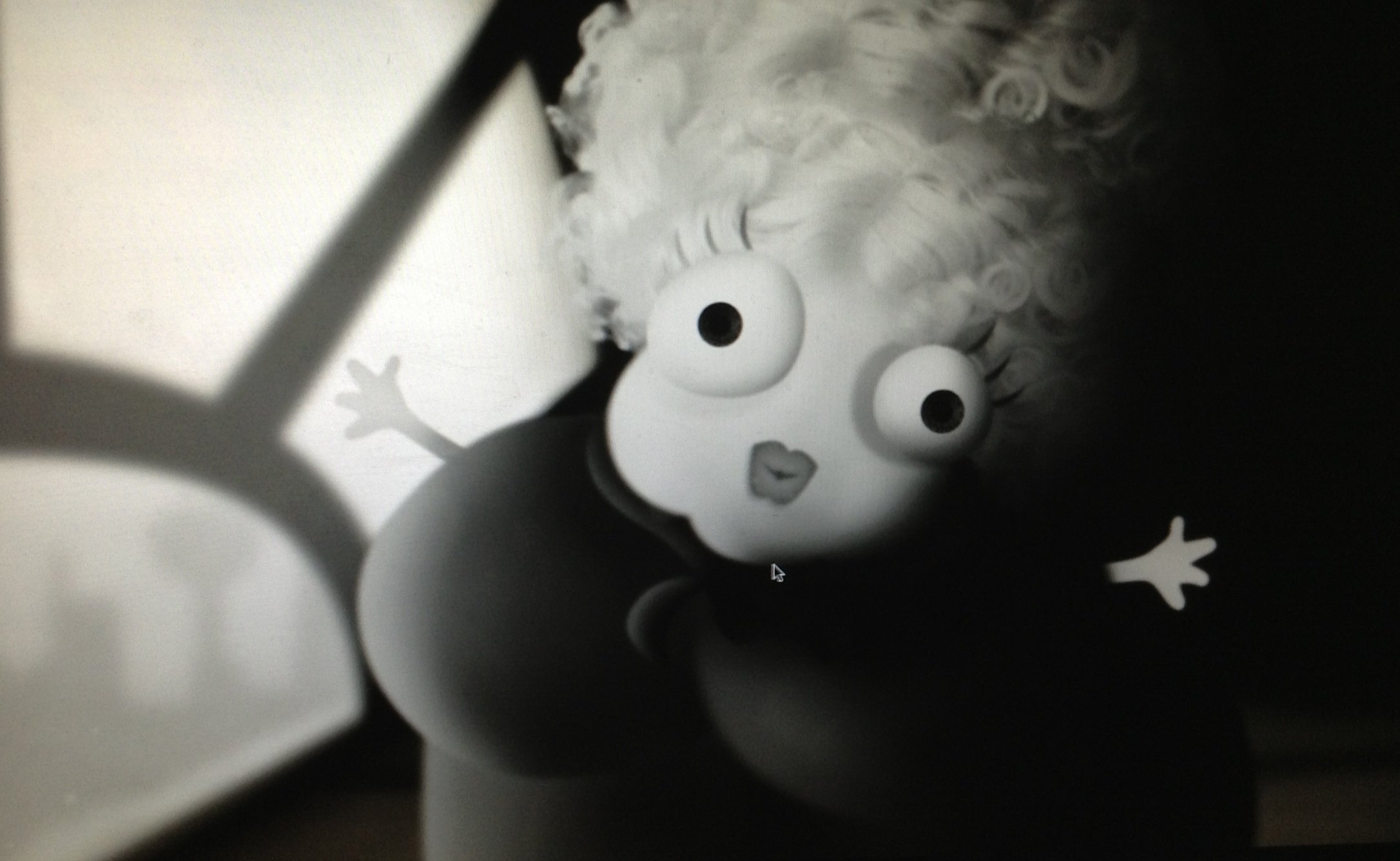 Description: A black and white photo of a person with a fake face on it's head and a pair of scissors.