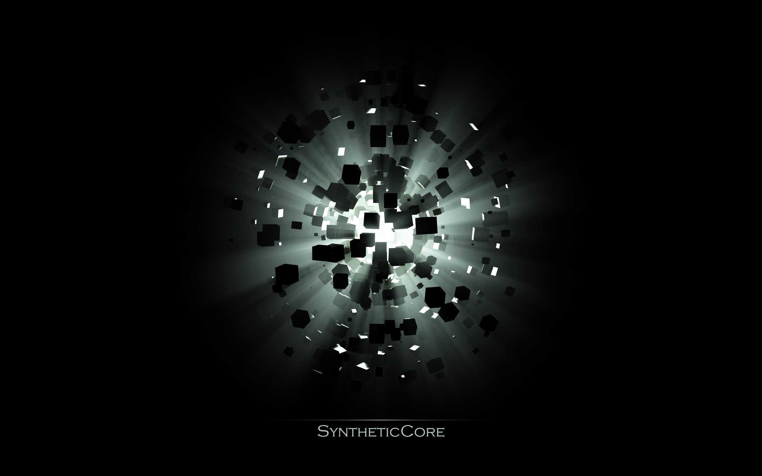 Description: A black and white photo of a square object with a light coming out of it's center and the words synthecode.