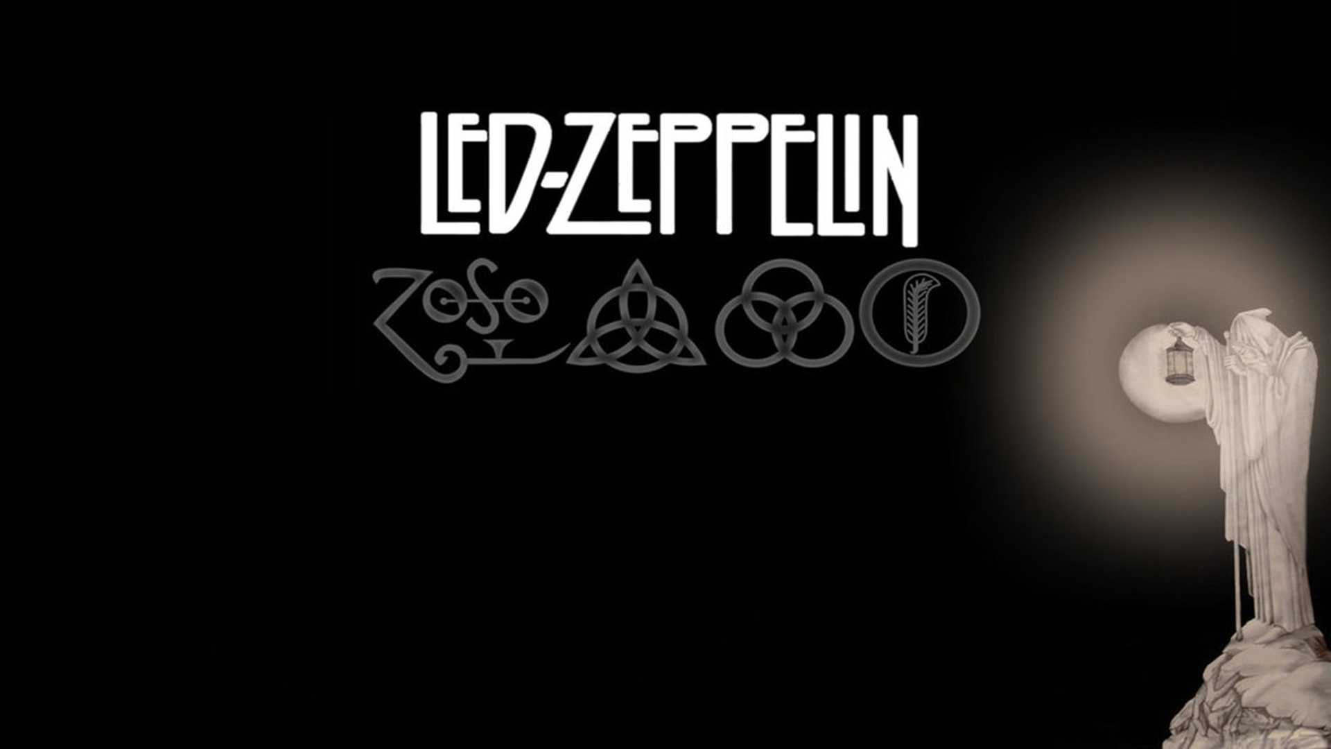 Description: A black and white photo of a statue with a light shining on it's head and the words ledzeptelin above it.