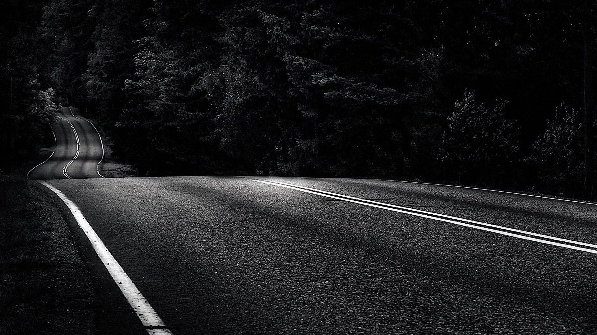 Description: A black and white photo of a road with trees in the background and a stop sign on the side of the road.