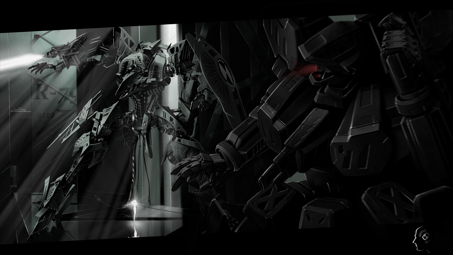 Description: A black and white photo of a robot standing in front of a mirror with a light shining on it.