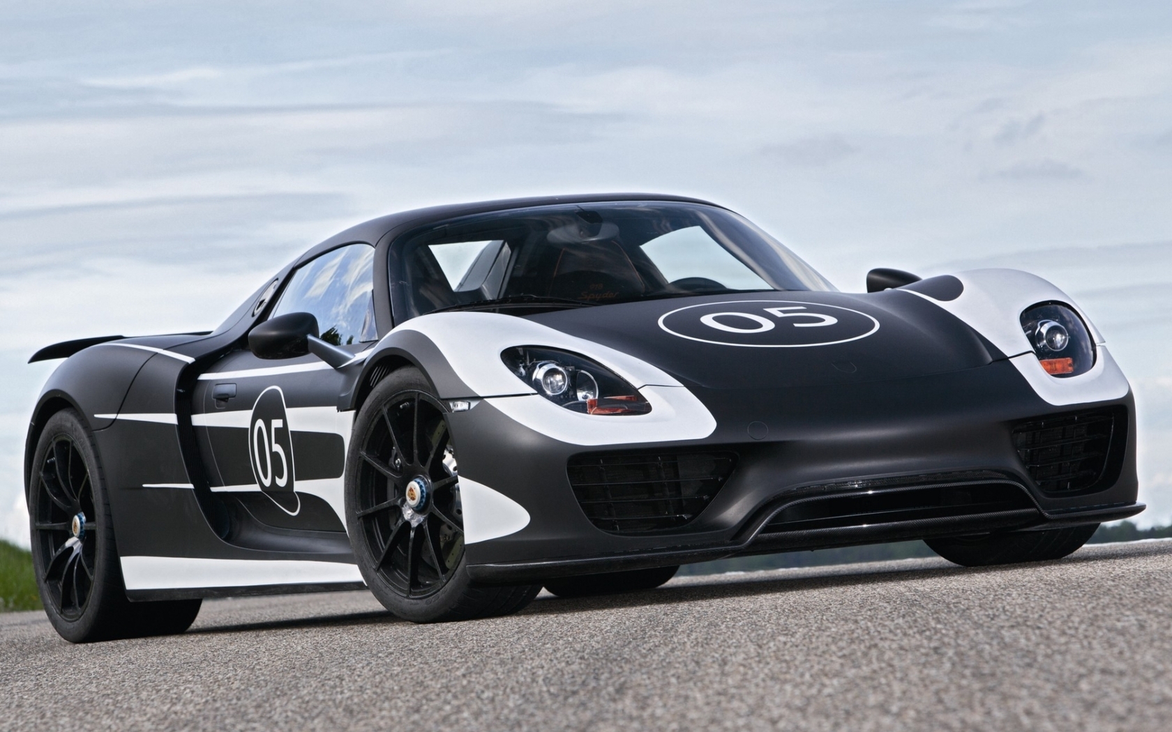 Description: A black and white sports car driving down a road next to a field of grass and a sky background.