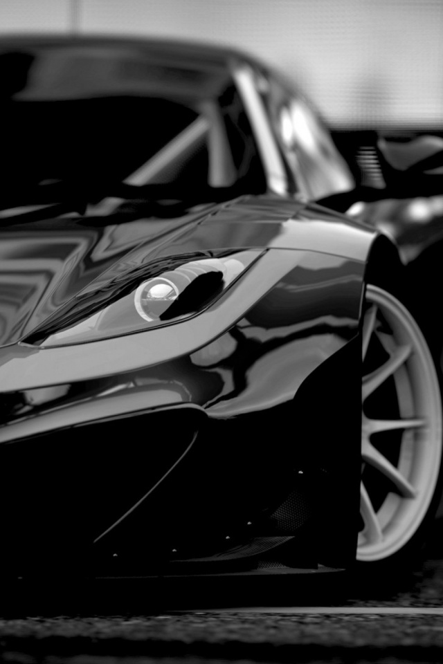 Description: A black and white photo of a sports car in motion on a road side with a blurry background.