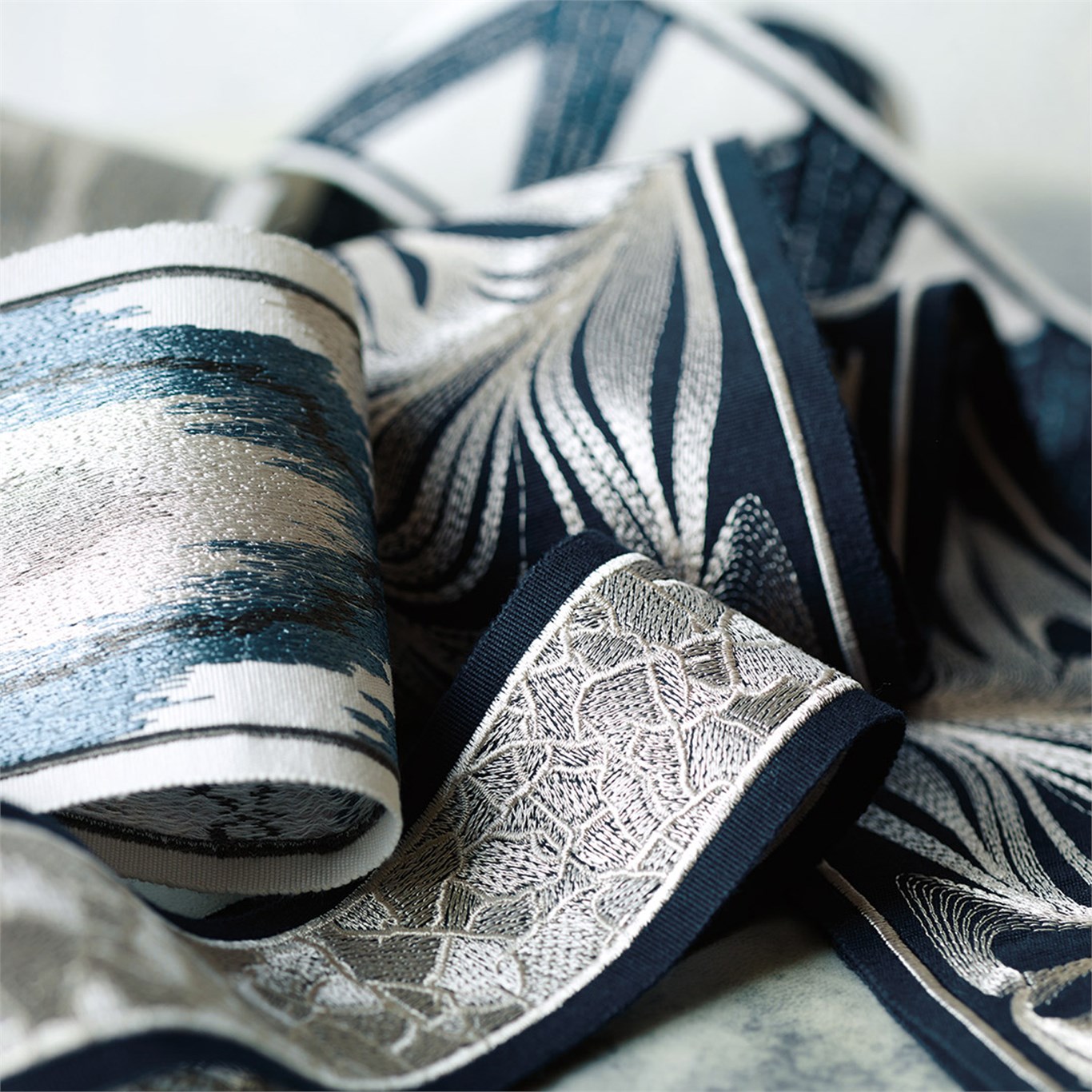 Description: A close up of a black and white tie on a table cloth with a roll of fabric on it.