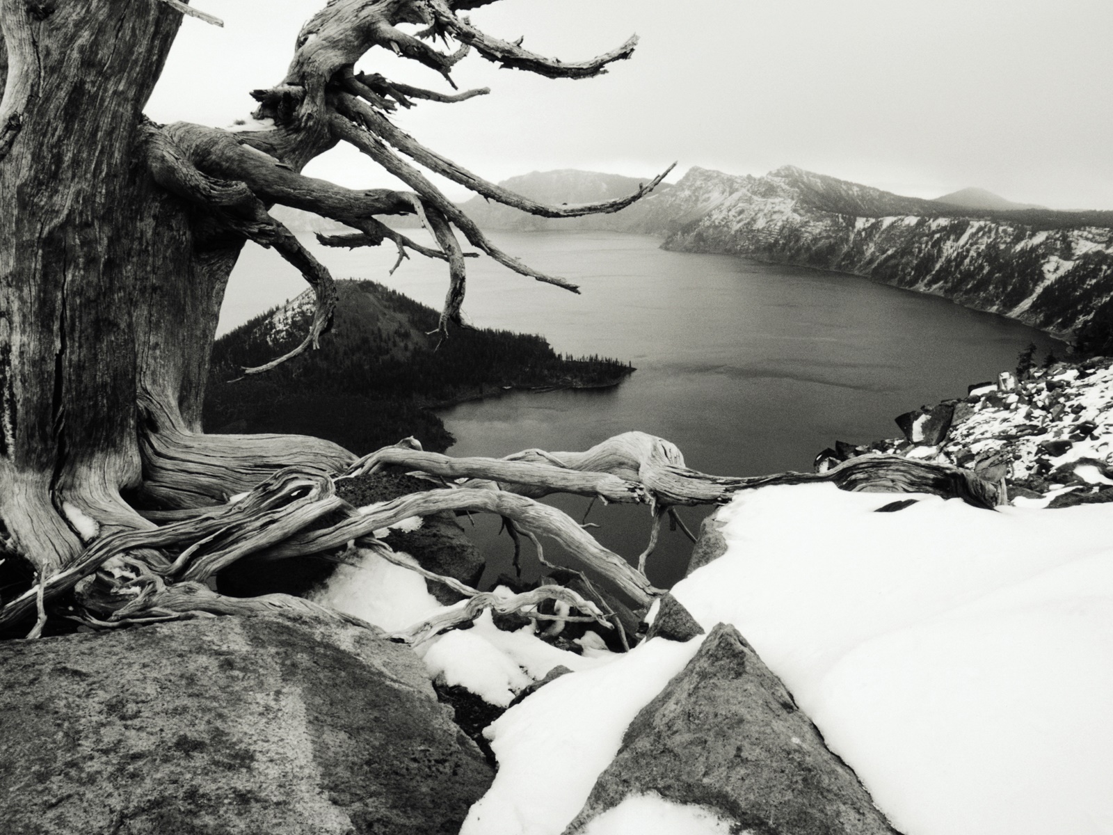 Description: A black and white photo of a tree and water in the background with snow on the ground and rocks.