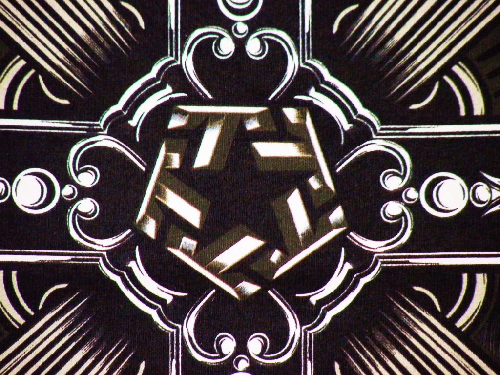 Description: A black and white photo of a decorative design on a wallpaper background with a cross in the center.