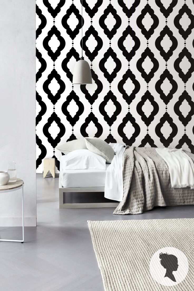 Description: A bedroom with a black and white wallpaper and a bed with a white comforter and a white rug.