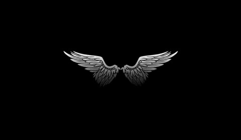 Description: A black and white photo of two wings on a black background with a reflection of the wing of an angel.
