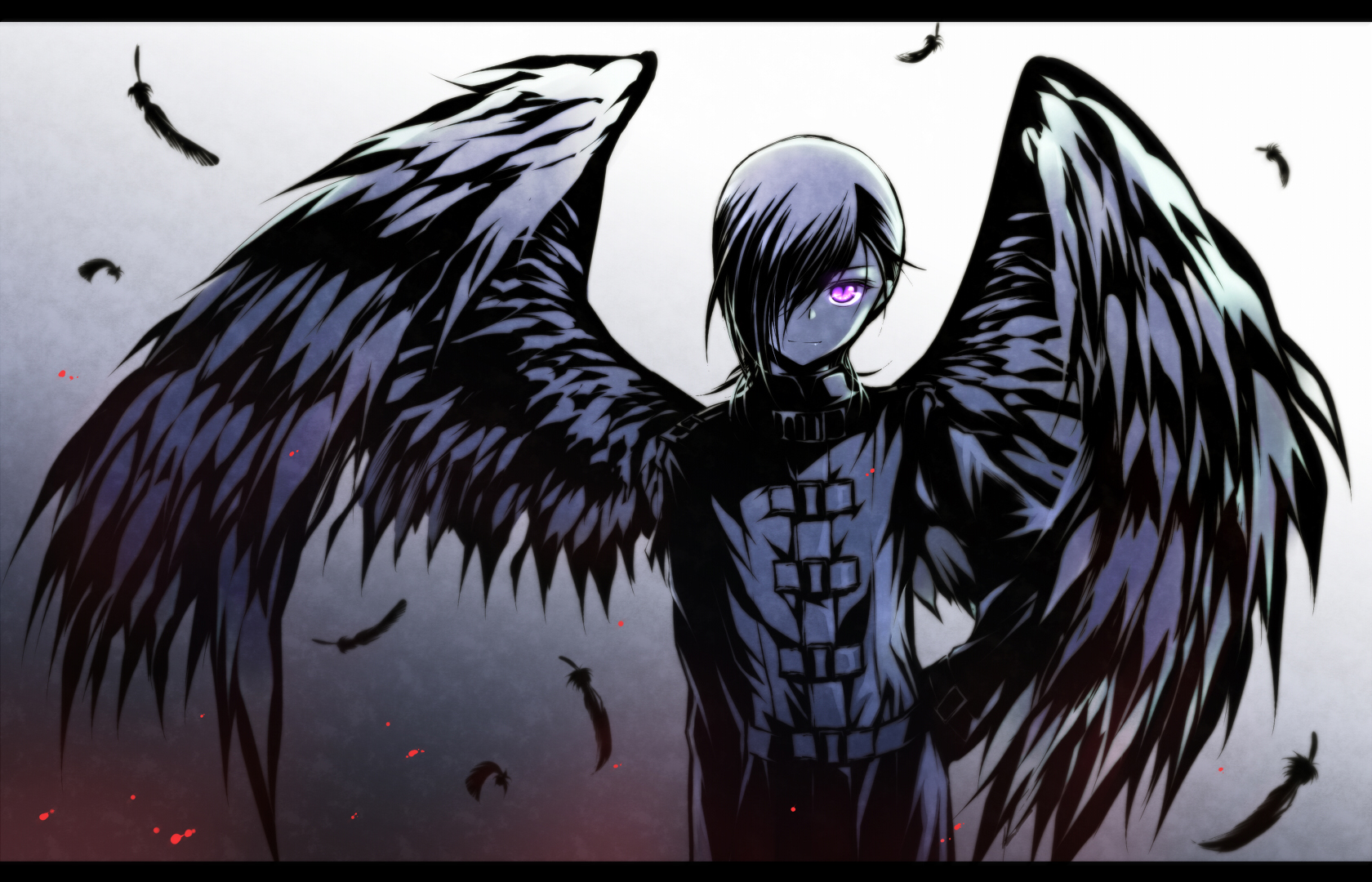 Description: A man with black wings standing in front of a white background with birds flying around him and a red light in the middle of the picture.