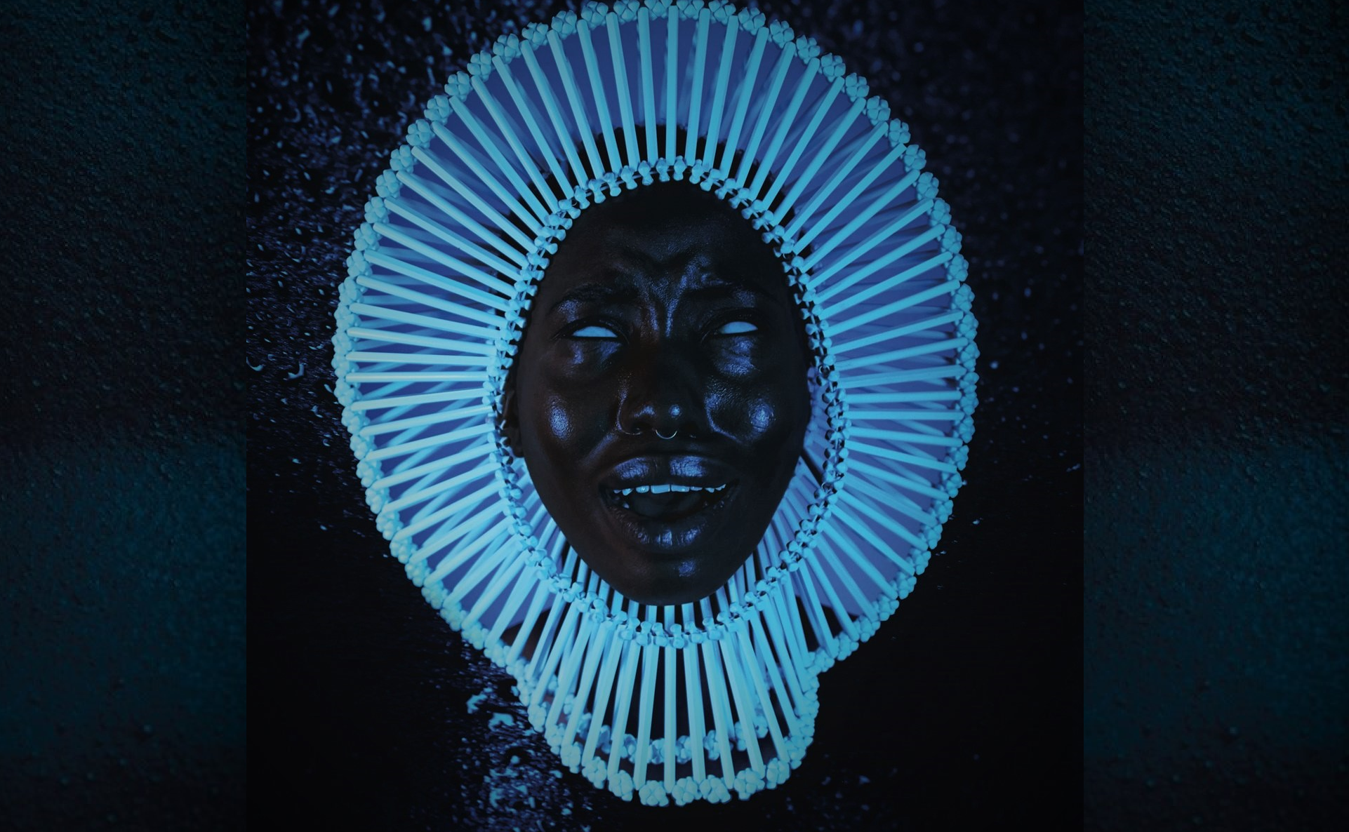 Description: A black woman's face is illuminated by a blue light in a dark room with a black background.