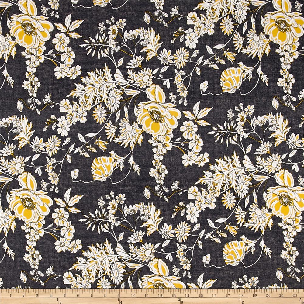Description: A black and yellow floral print fabric with white flowers on it.