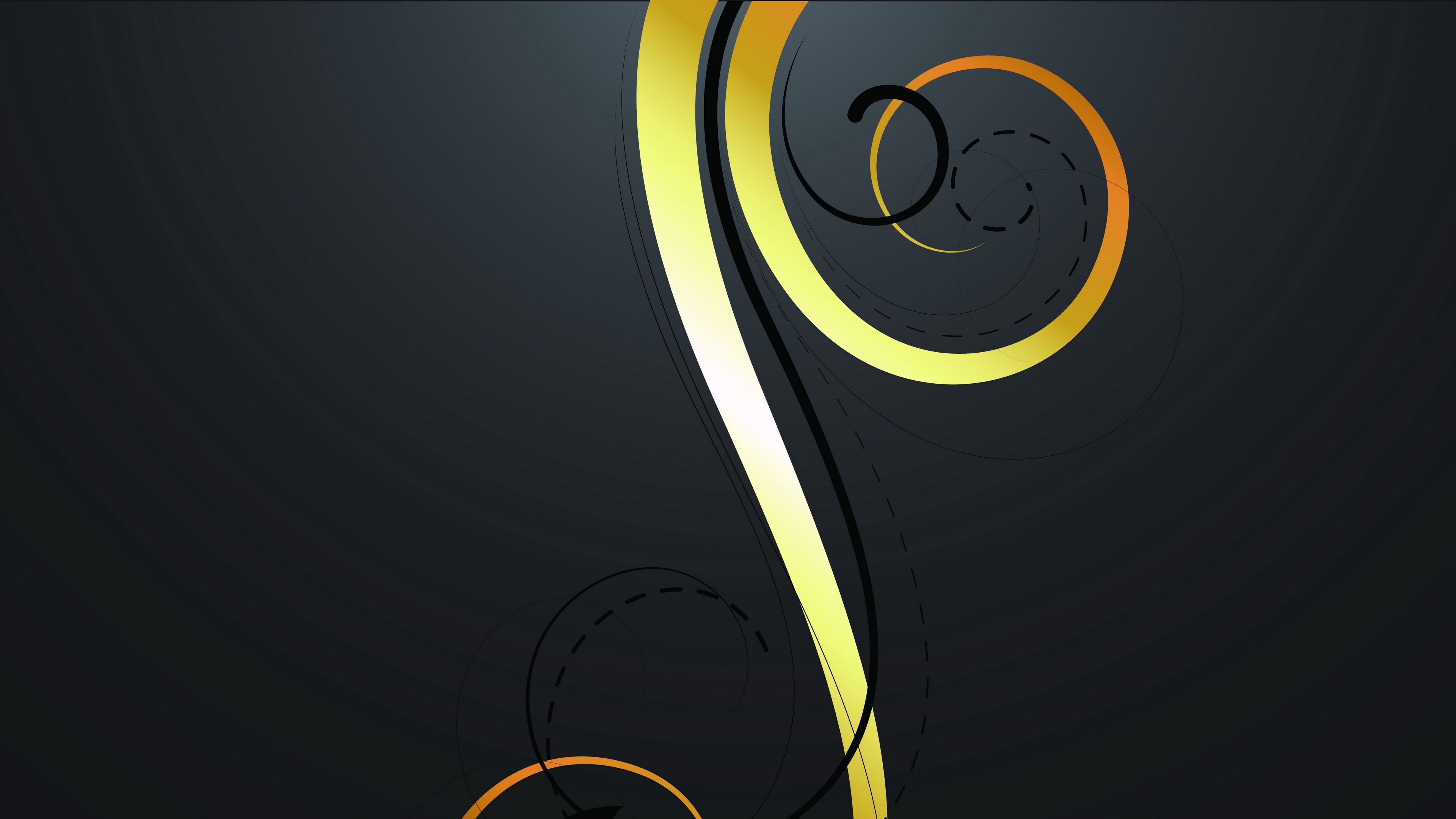 Description: A black and yellow background with swirls and dots on it's edges and a black background with a yellow stripe.