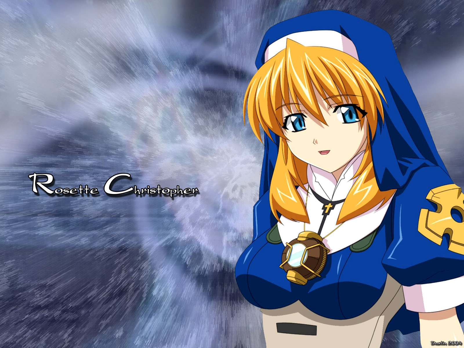 Description: A anime character with blonde hair and blue eyes wearing a blue outfit and holding a sword in her hand.