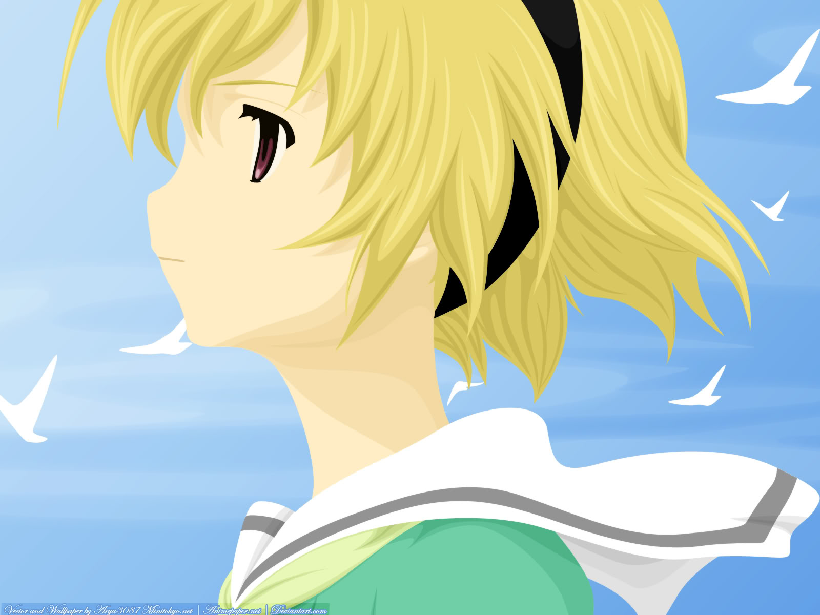 Description: A anime character with blonde hair and a green shirt and a white shirt and a blue sky with white birds.