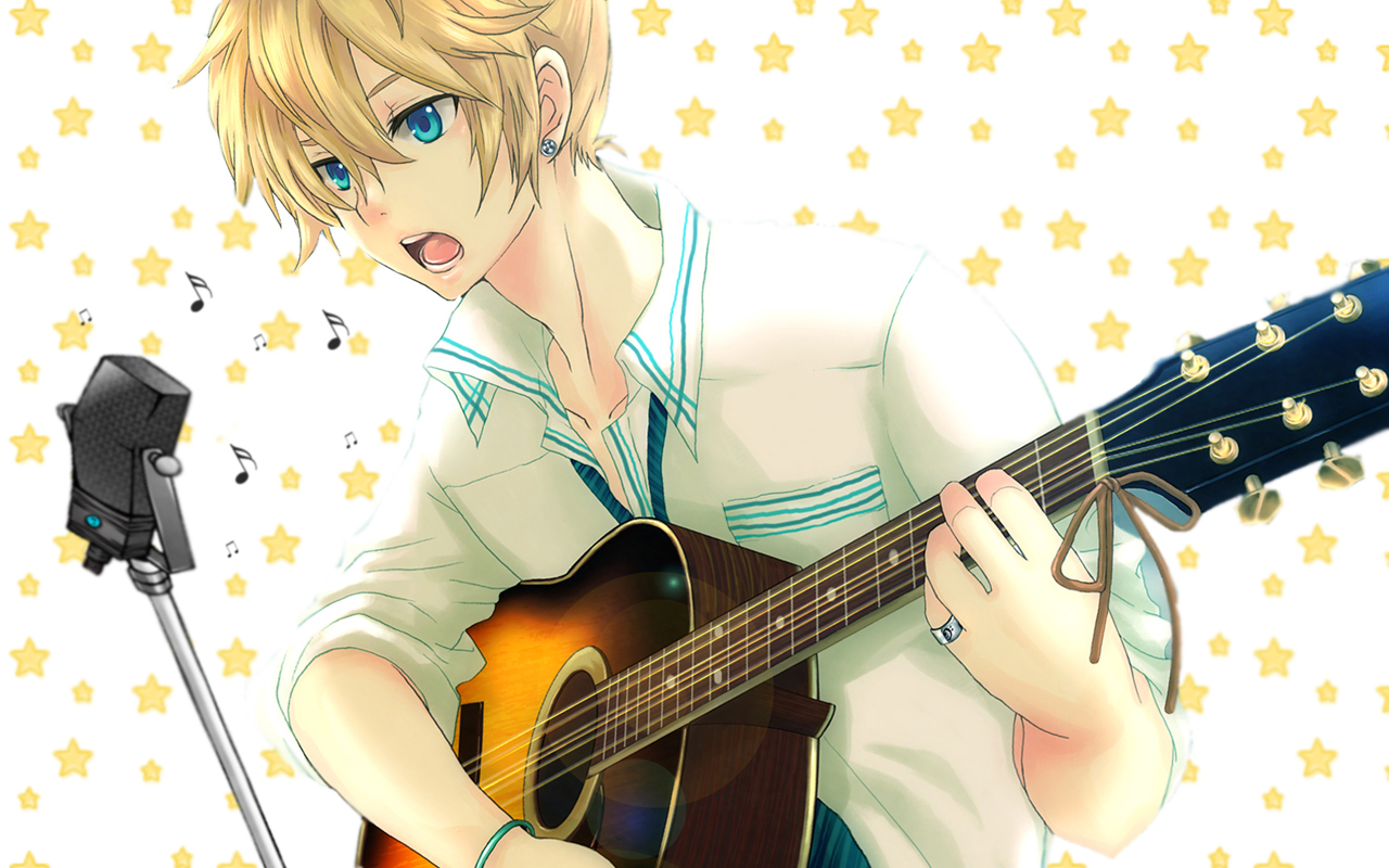 Description: A boy with blonde hair playing a guitar and singing into a microphone with a microphone stand nearby and a microphone.