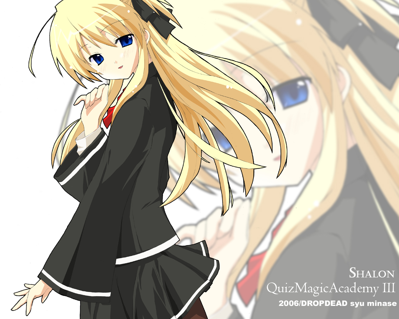 Description: A girl with long blonde hair and blue eyes is standing in front of a white background with a black dress.