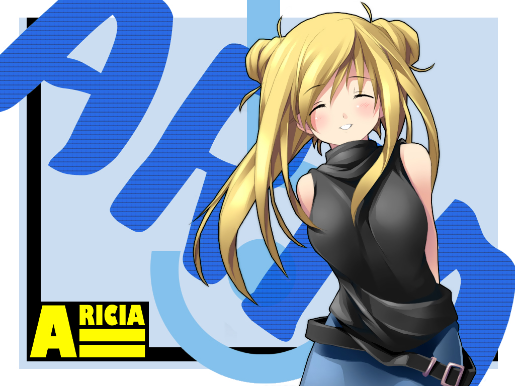 Description: A girl with long blonde hair and a black top is standing in front of a blue background with a yellow and black logo.