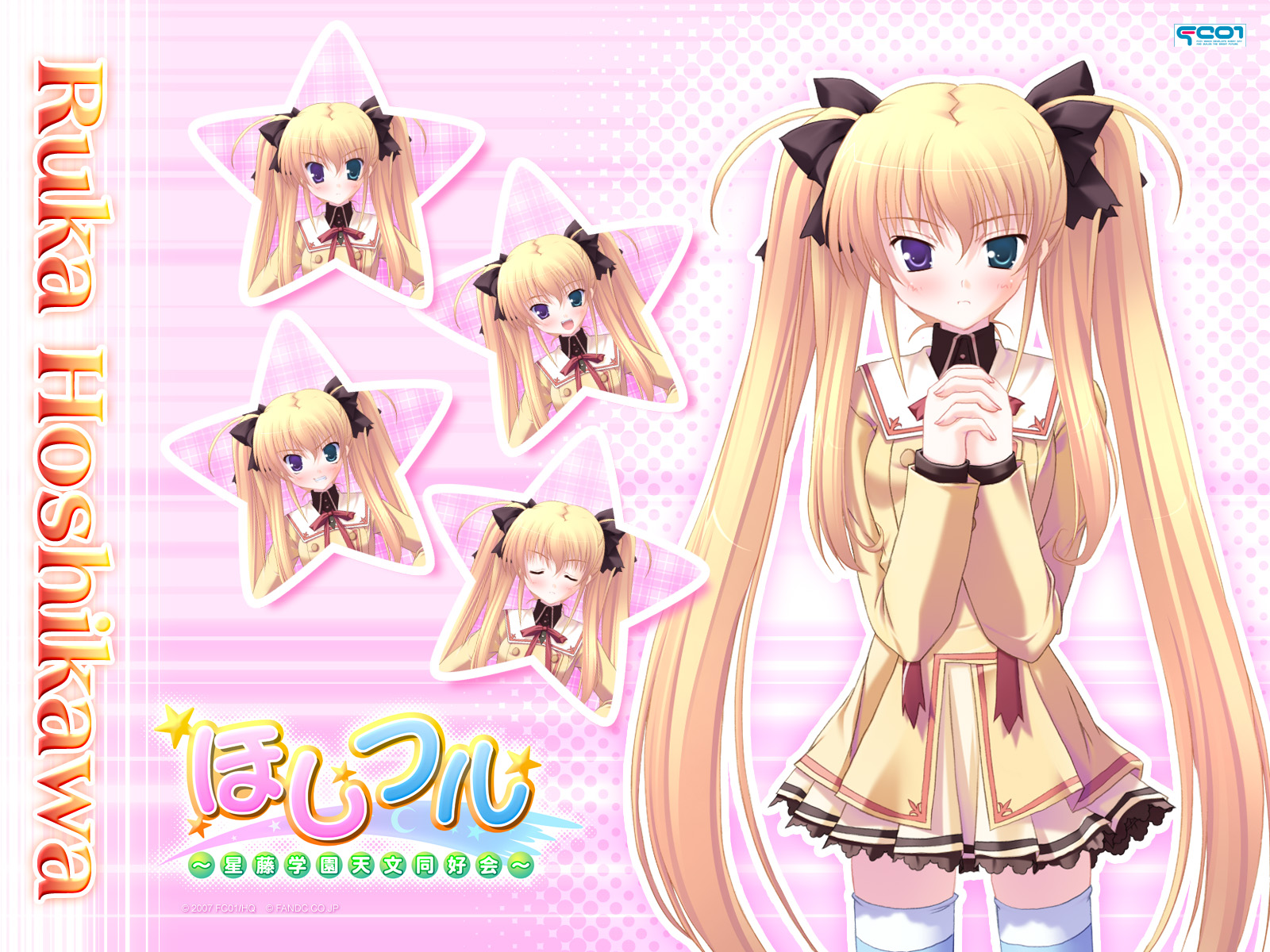 Description: A girl with long blonde hair and a bow tie standing in front of a pink background with various images of her.