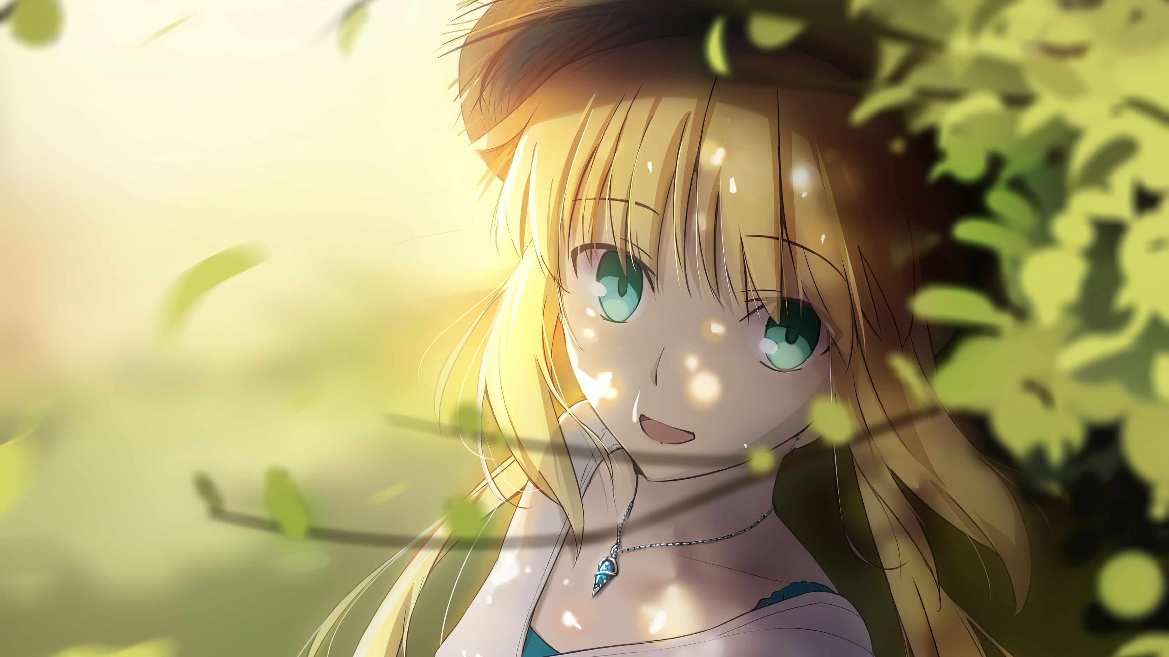 Description: A girl with long blonde hair and blue eyes standing in front of a tree with leaves on it and a green background.